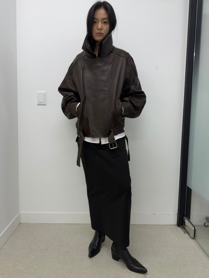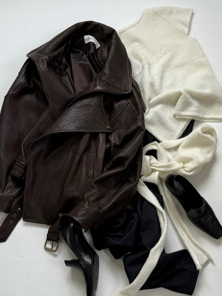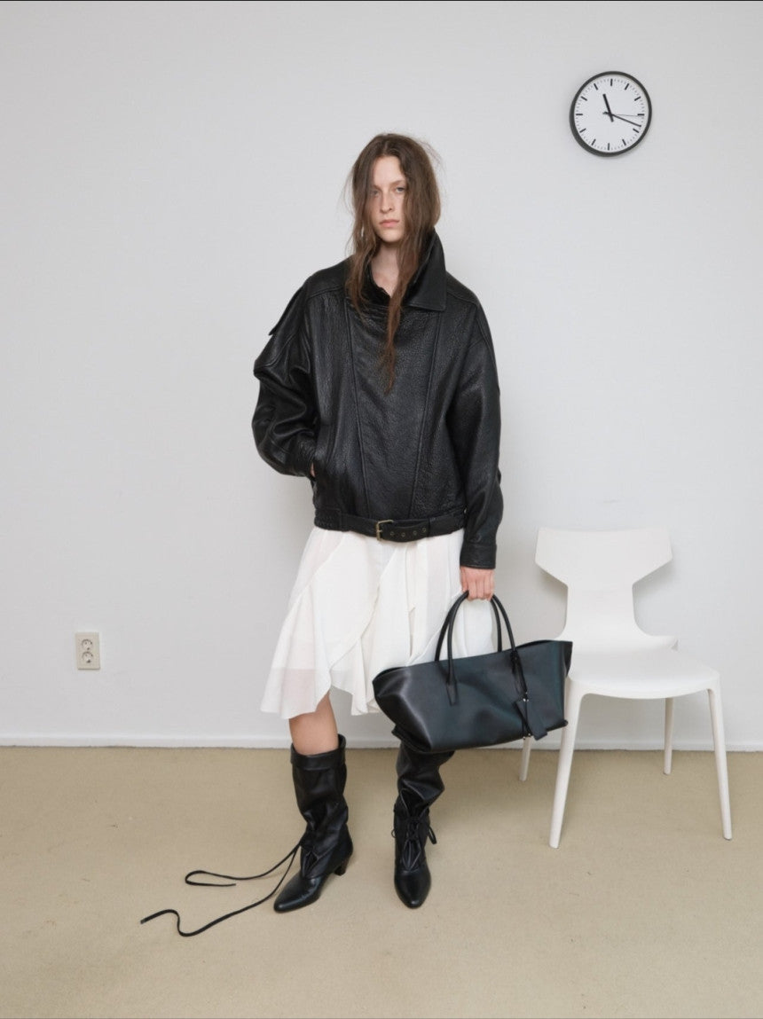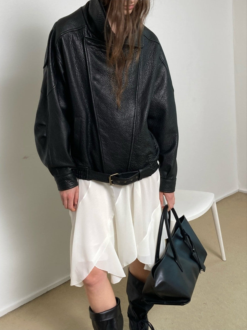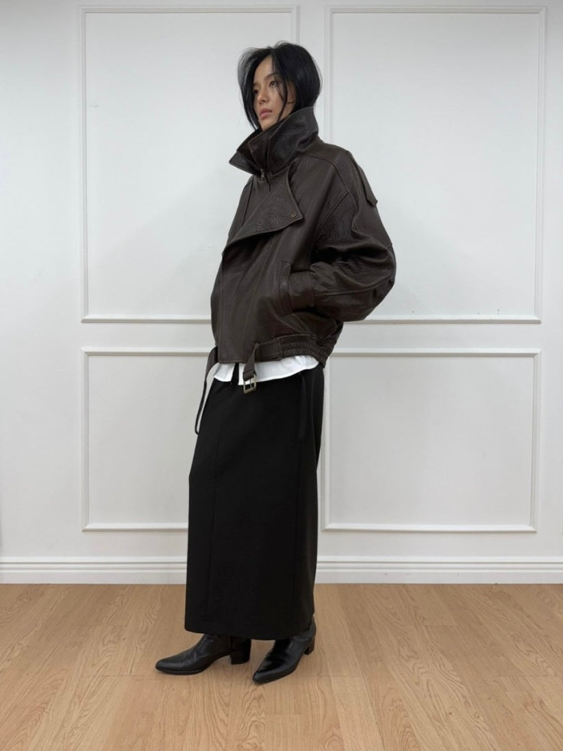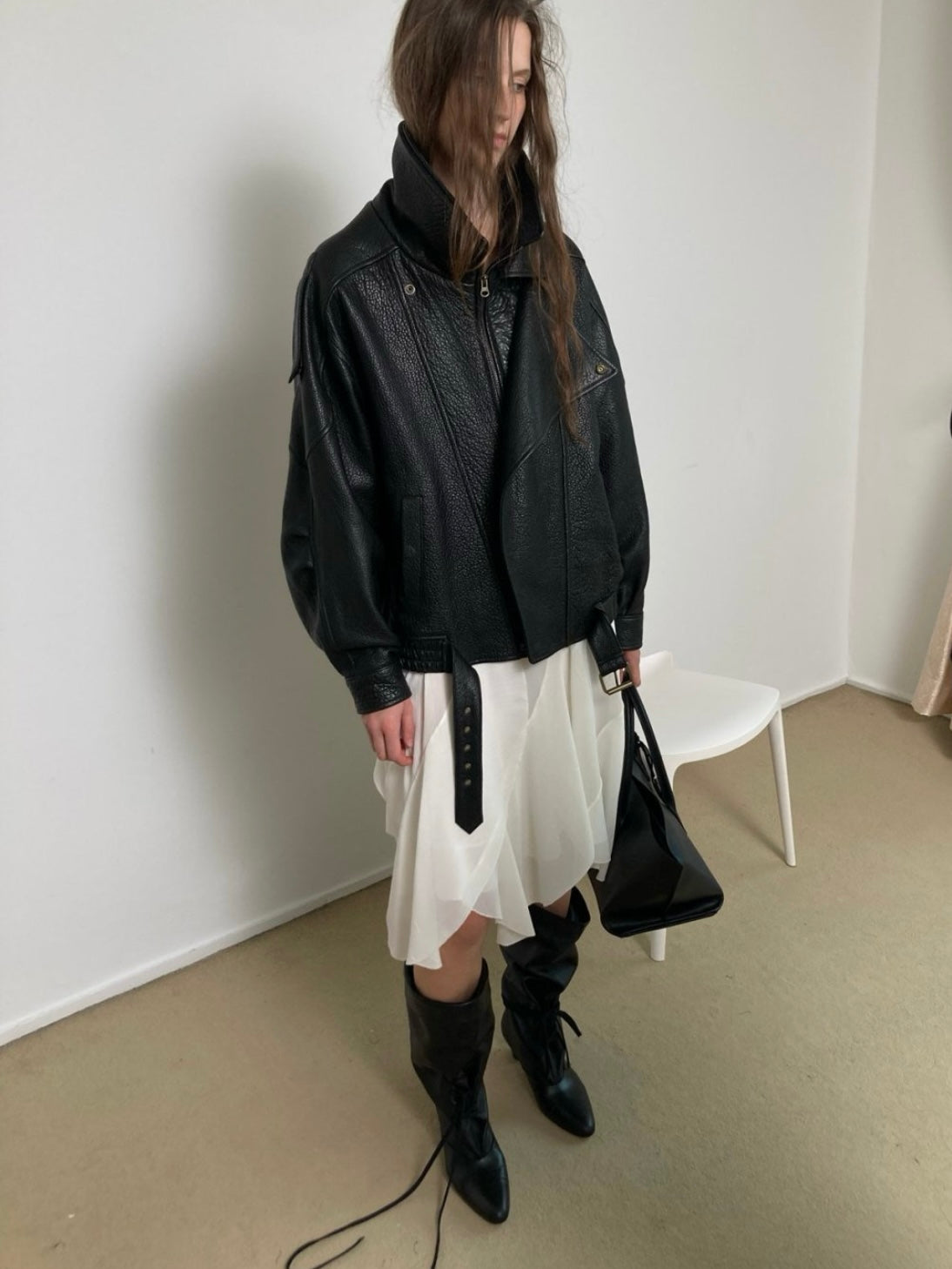 - Elasticized leather hem with adjustable belt for structure and versatility