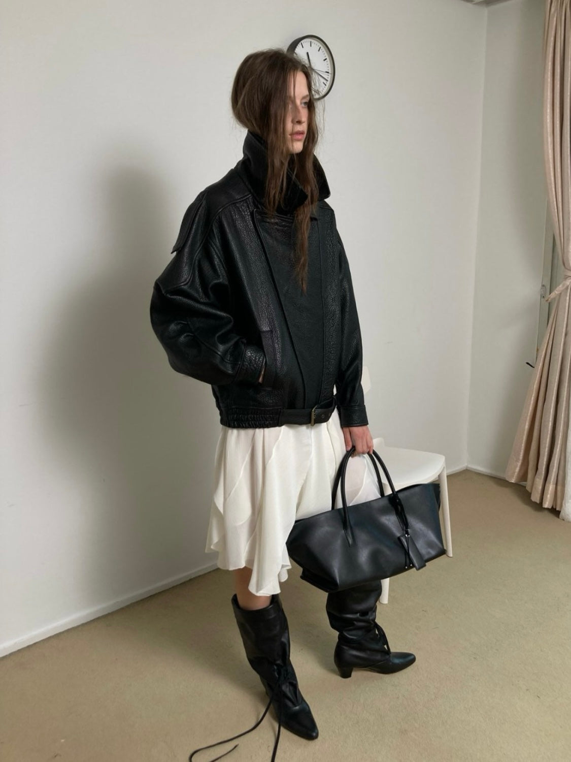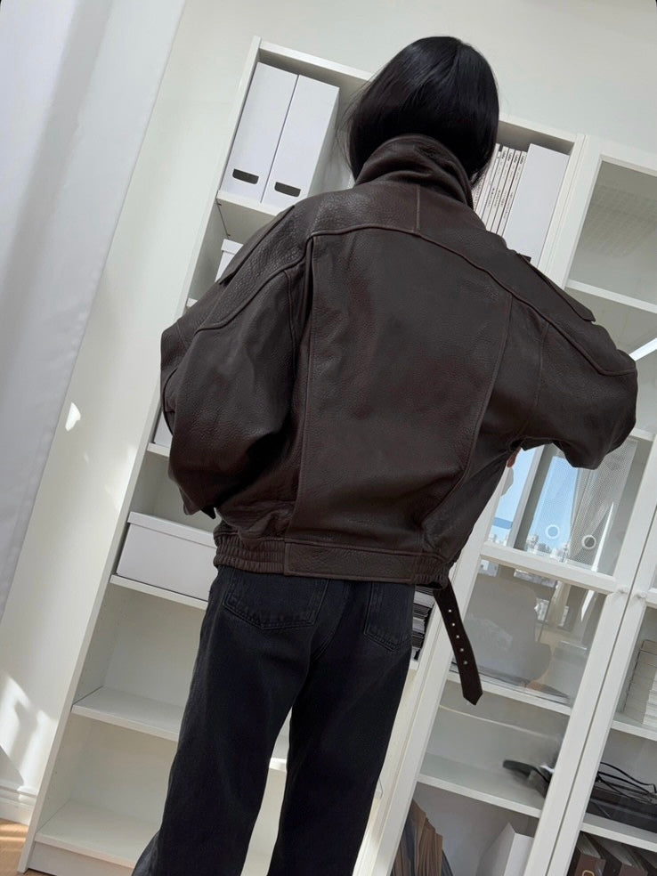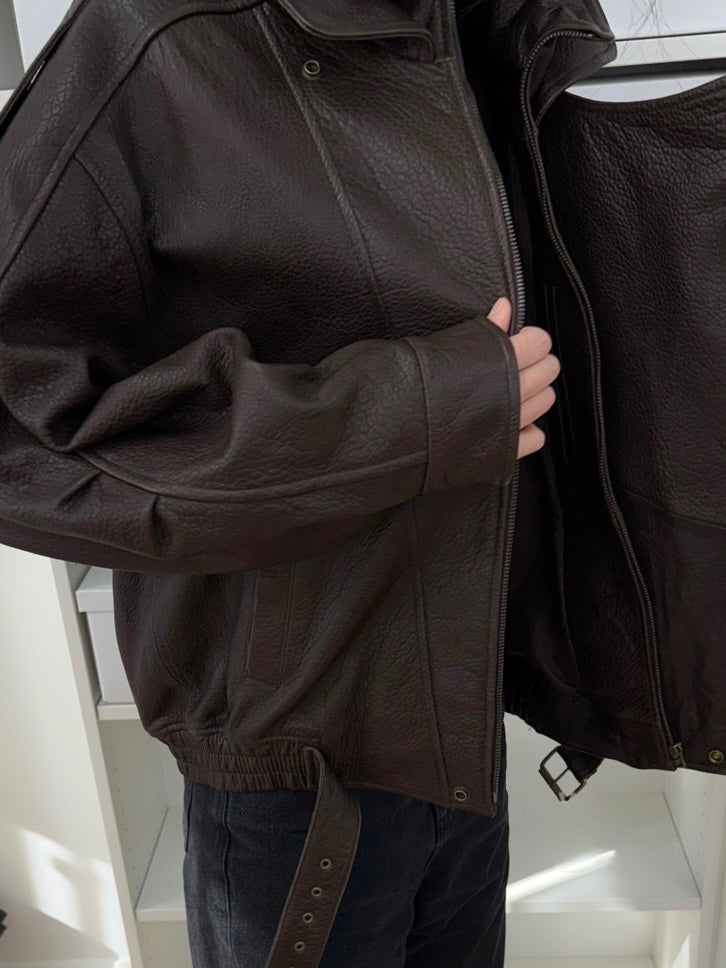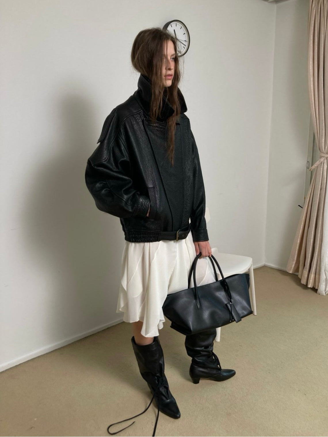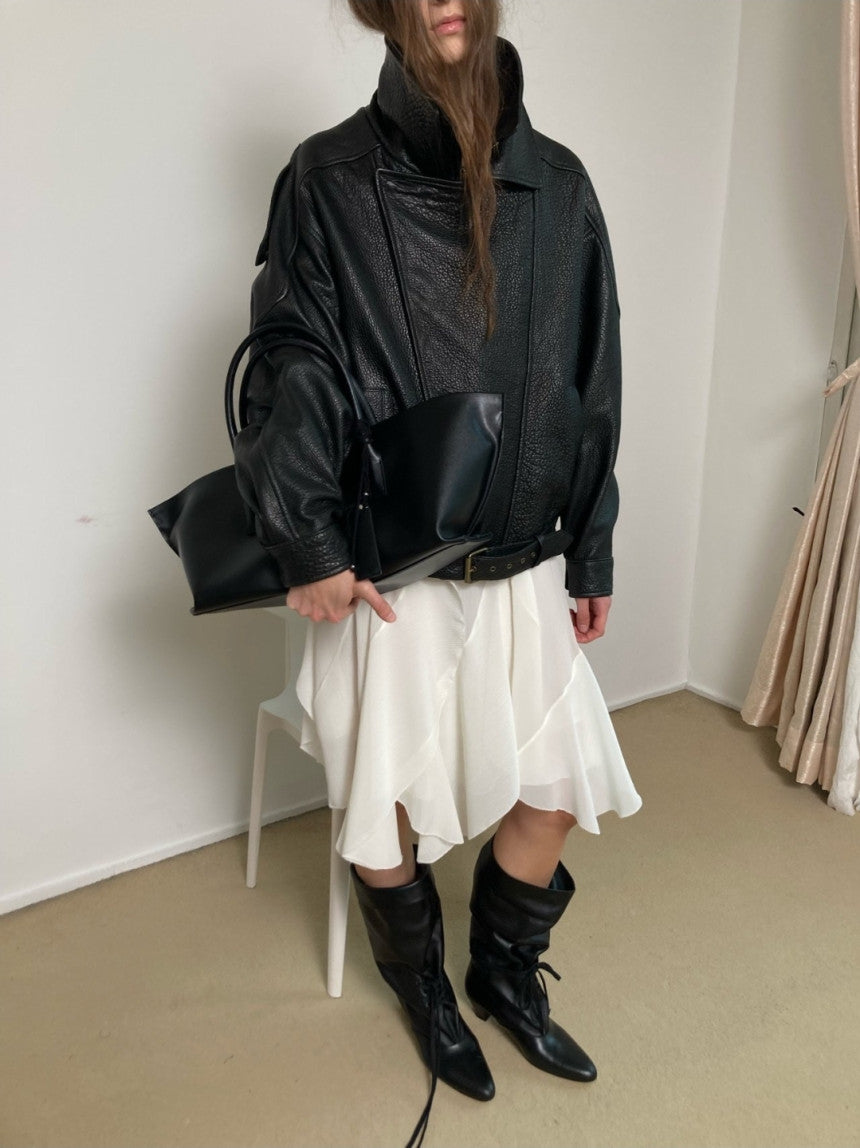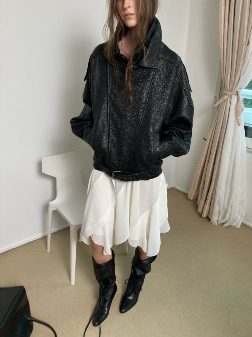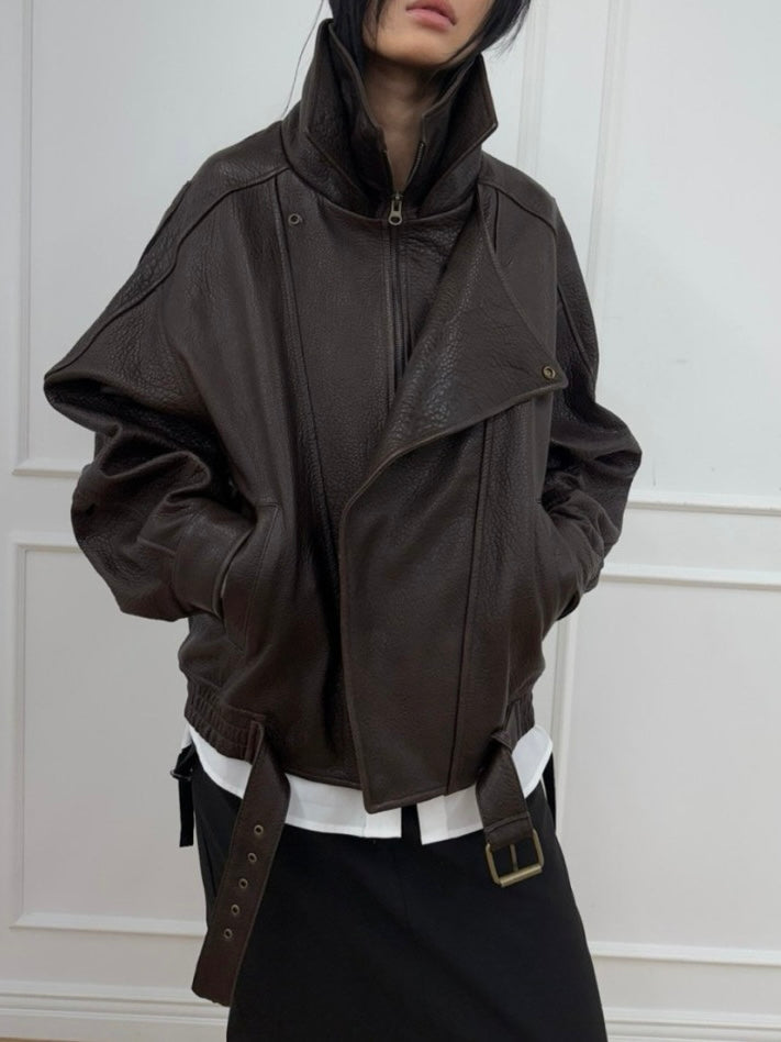 - Elasticized leather hem with adjustable belt for structure and versatility