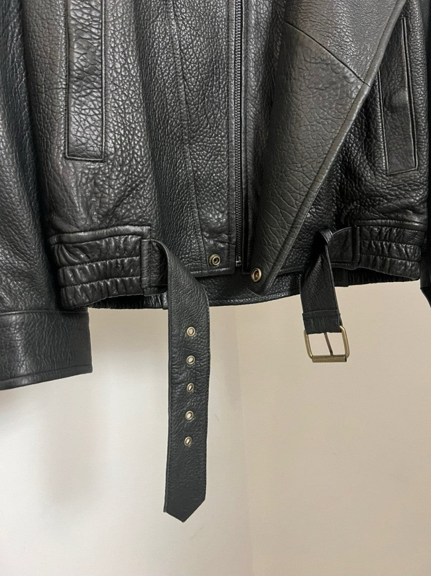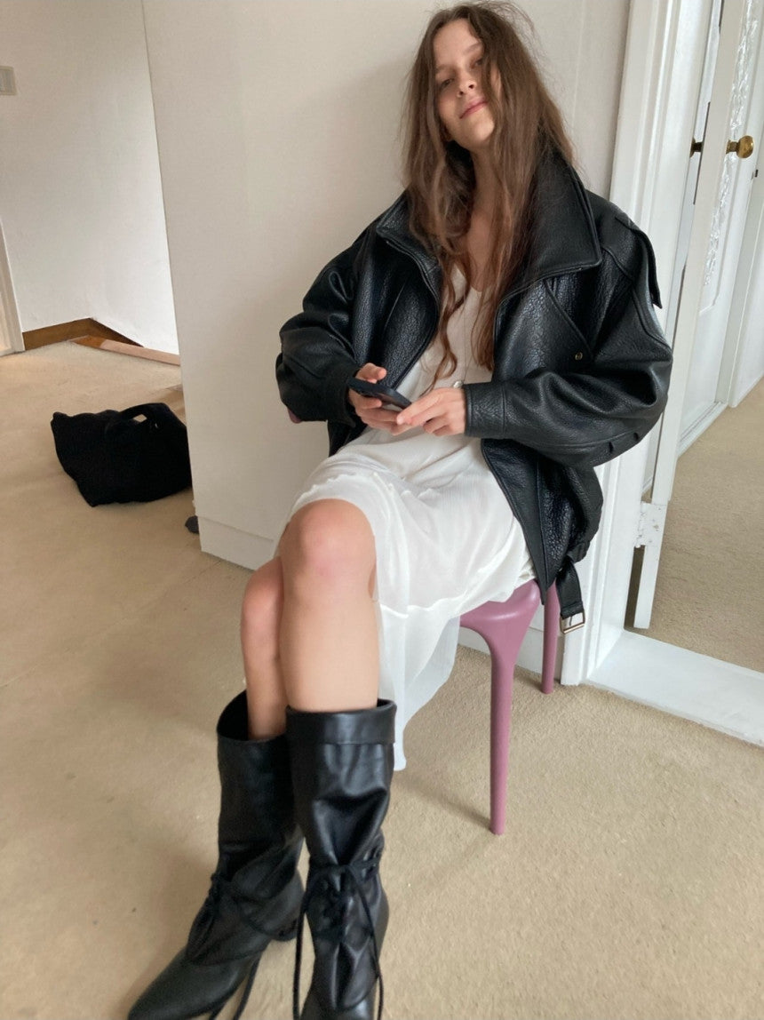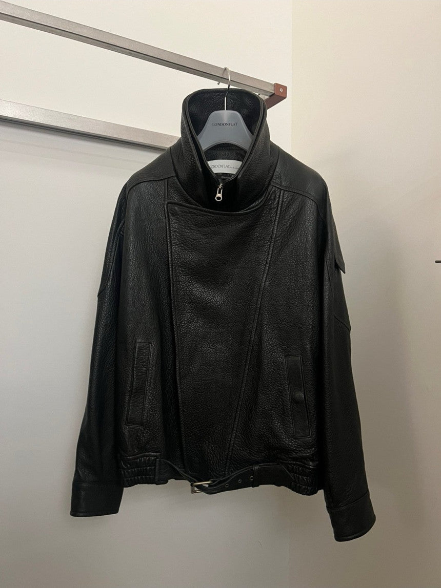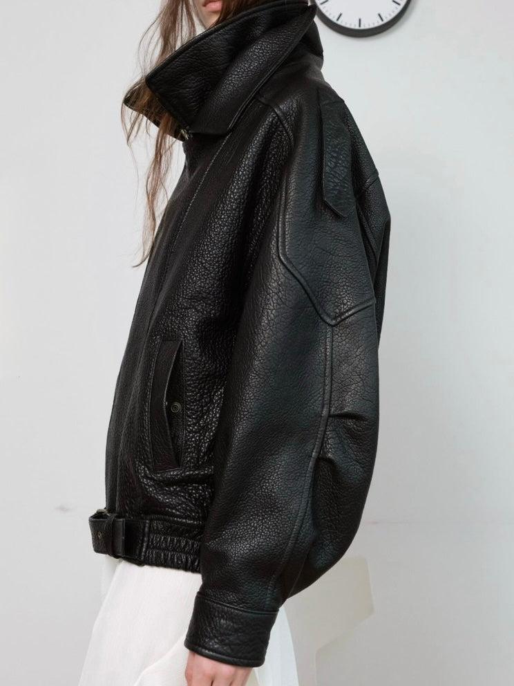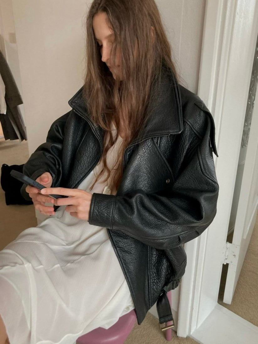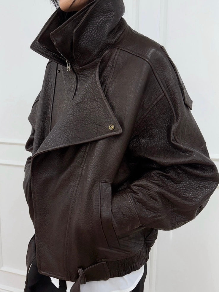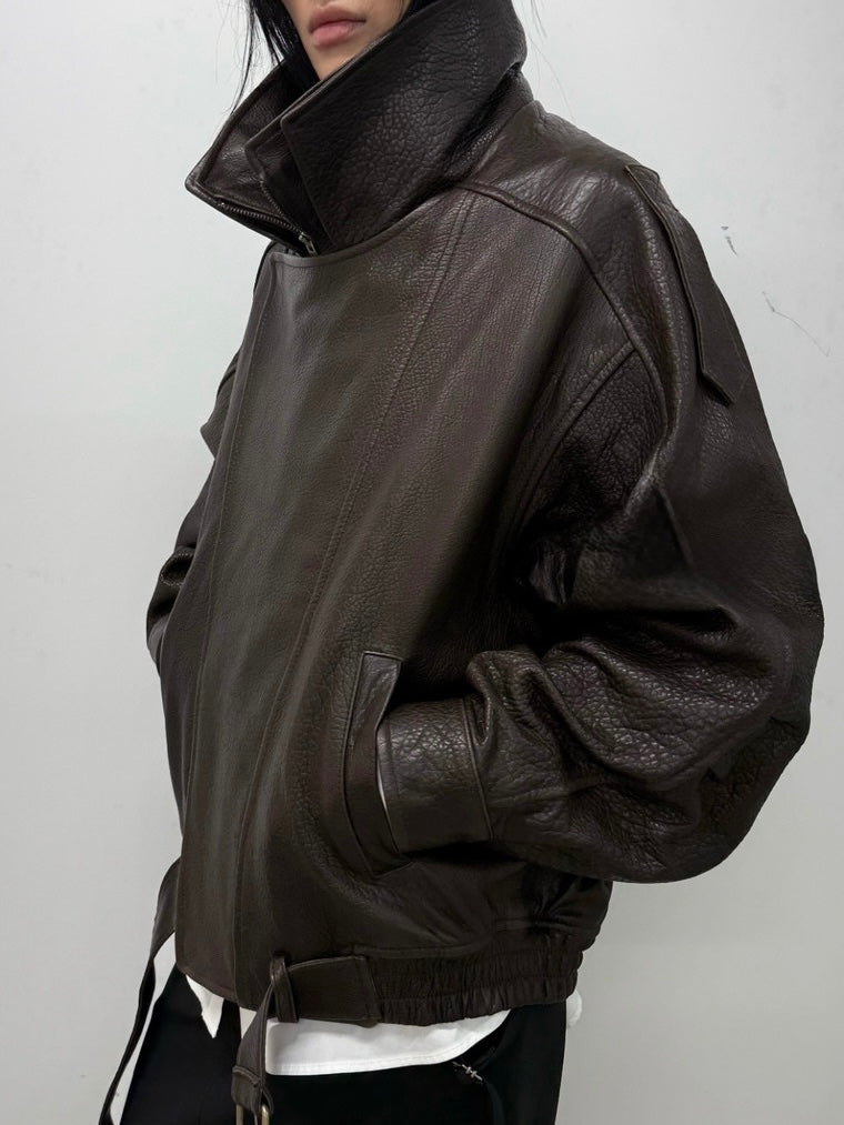- Elasticized leather hem with adjustable belt for structure and versatility