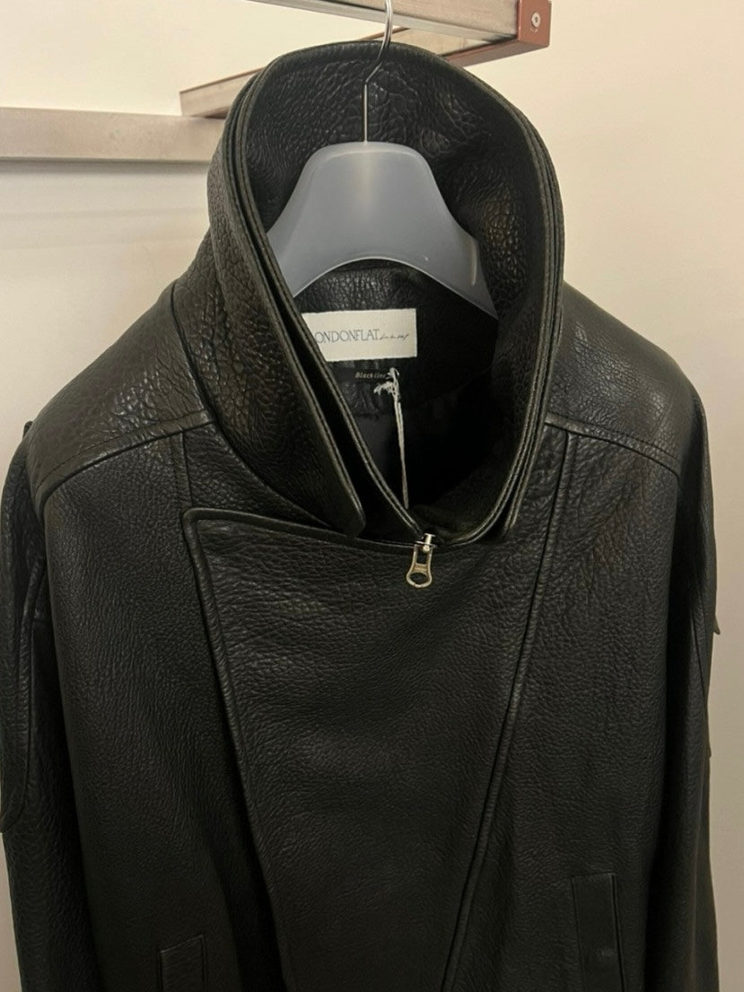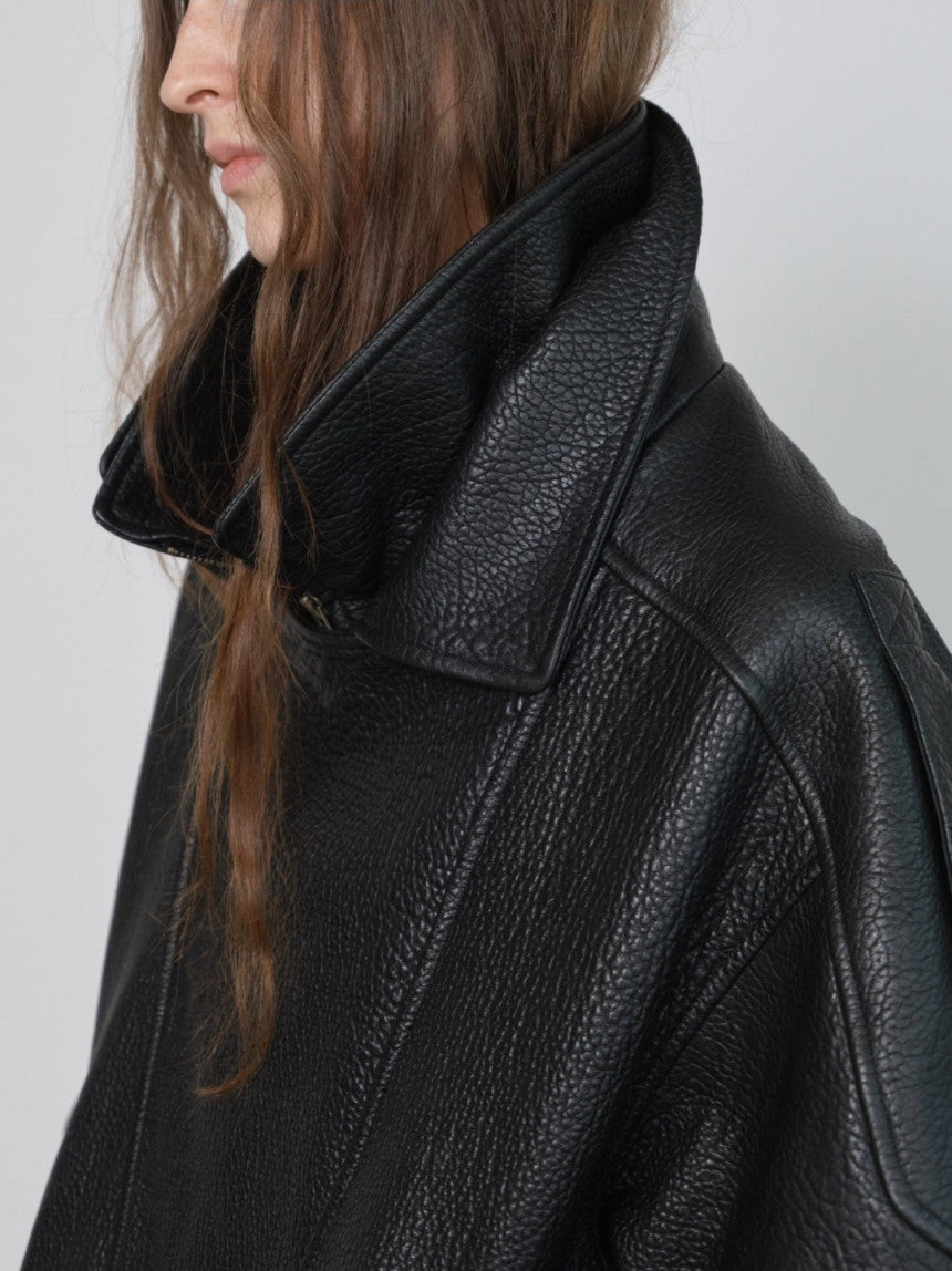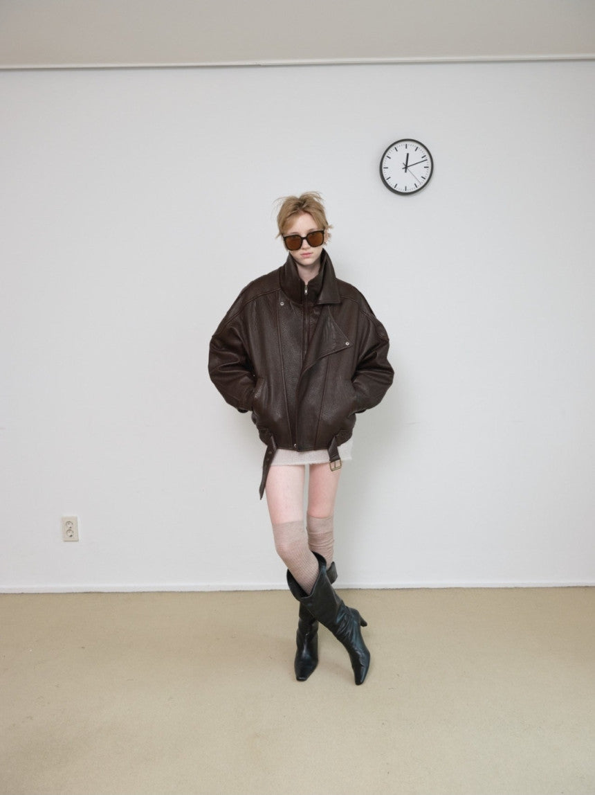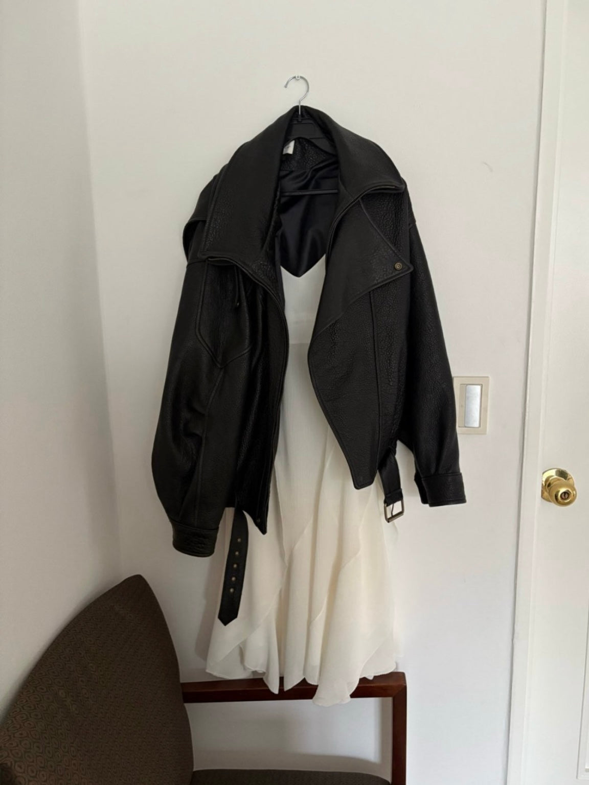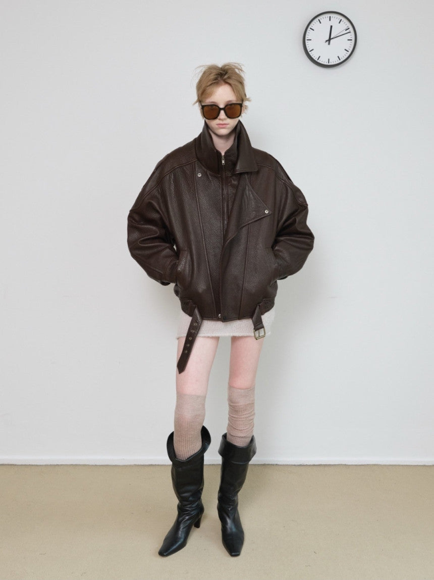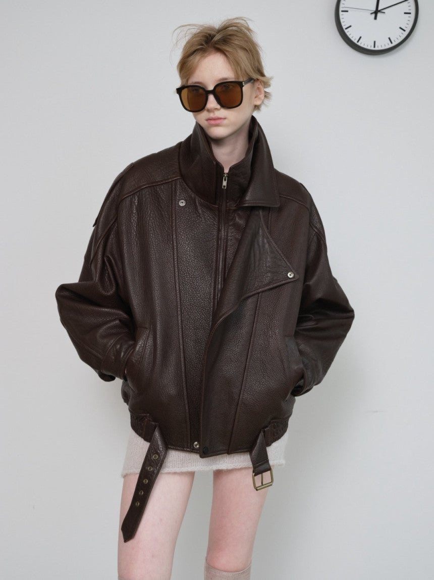 - Elasticized leather hem with adjustable belt for structure and versatility