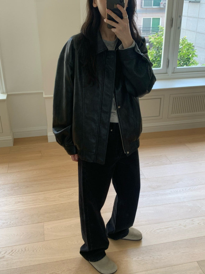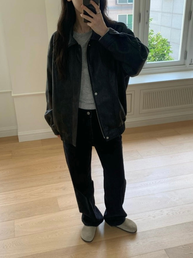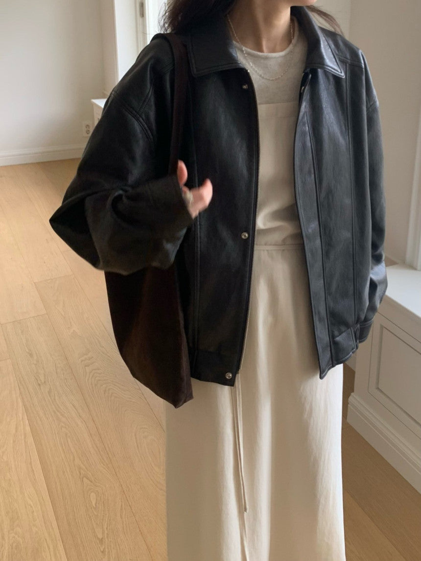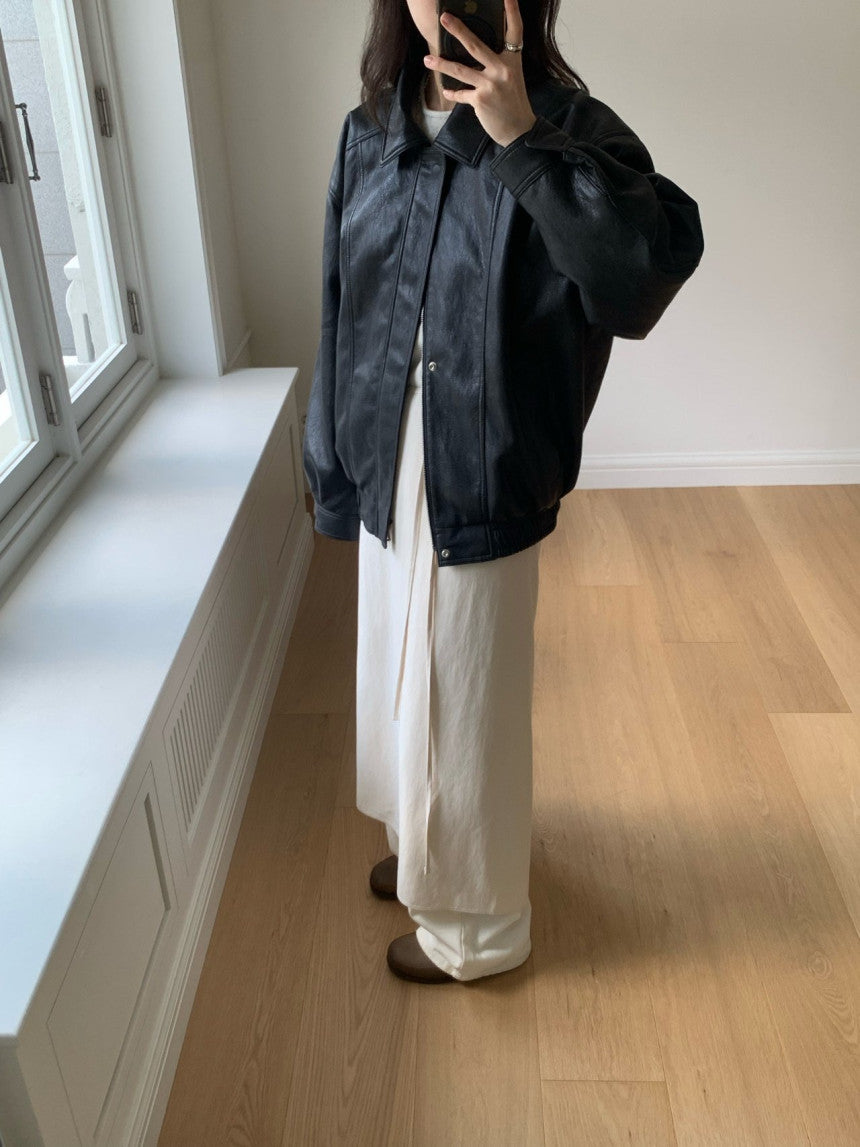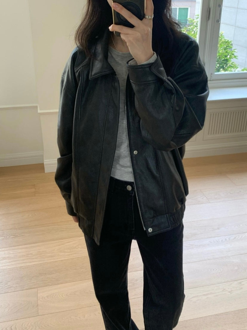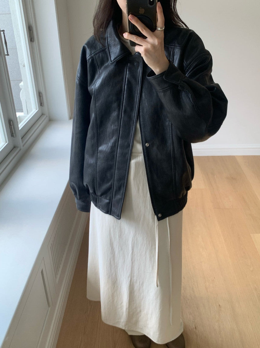 - Vegan leather jacket with vintage-inspired texture achieved through special washing process