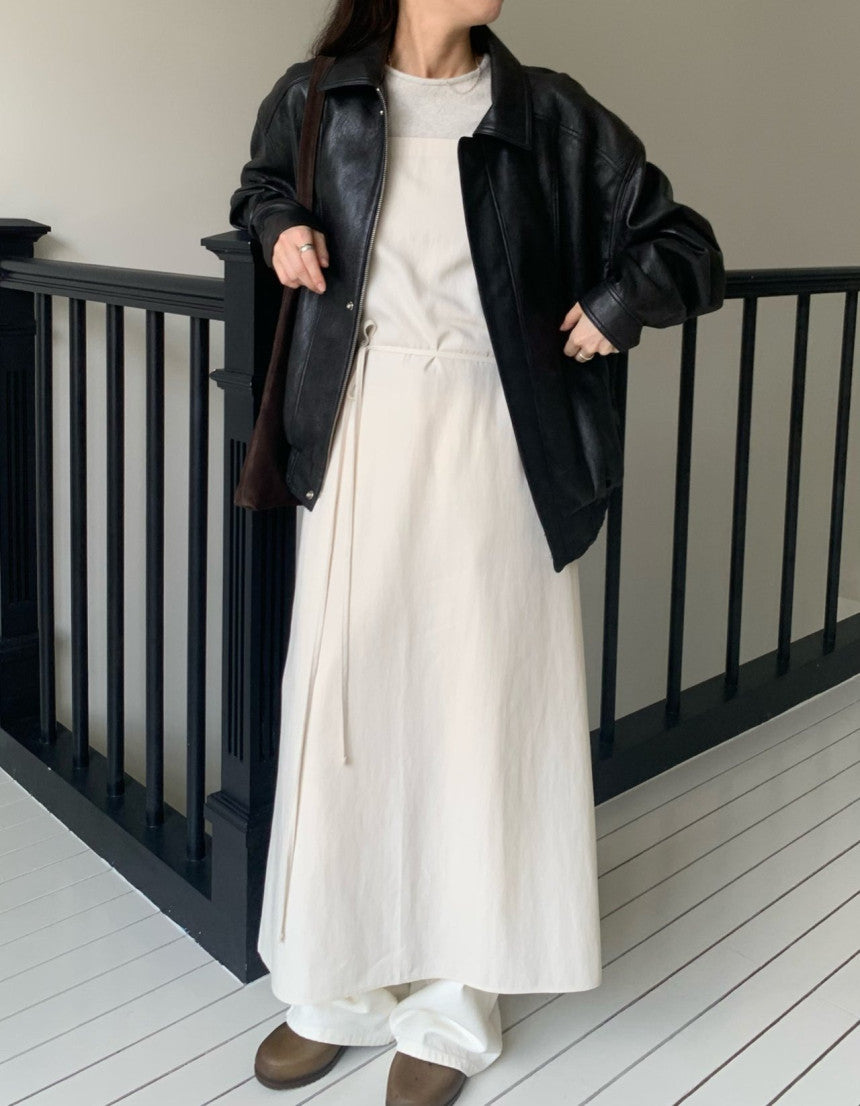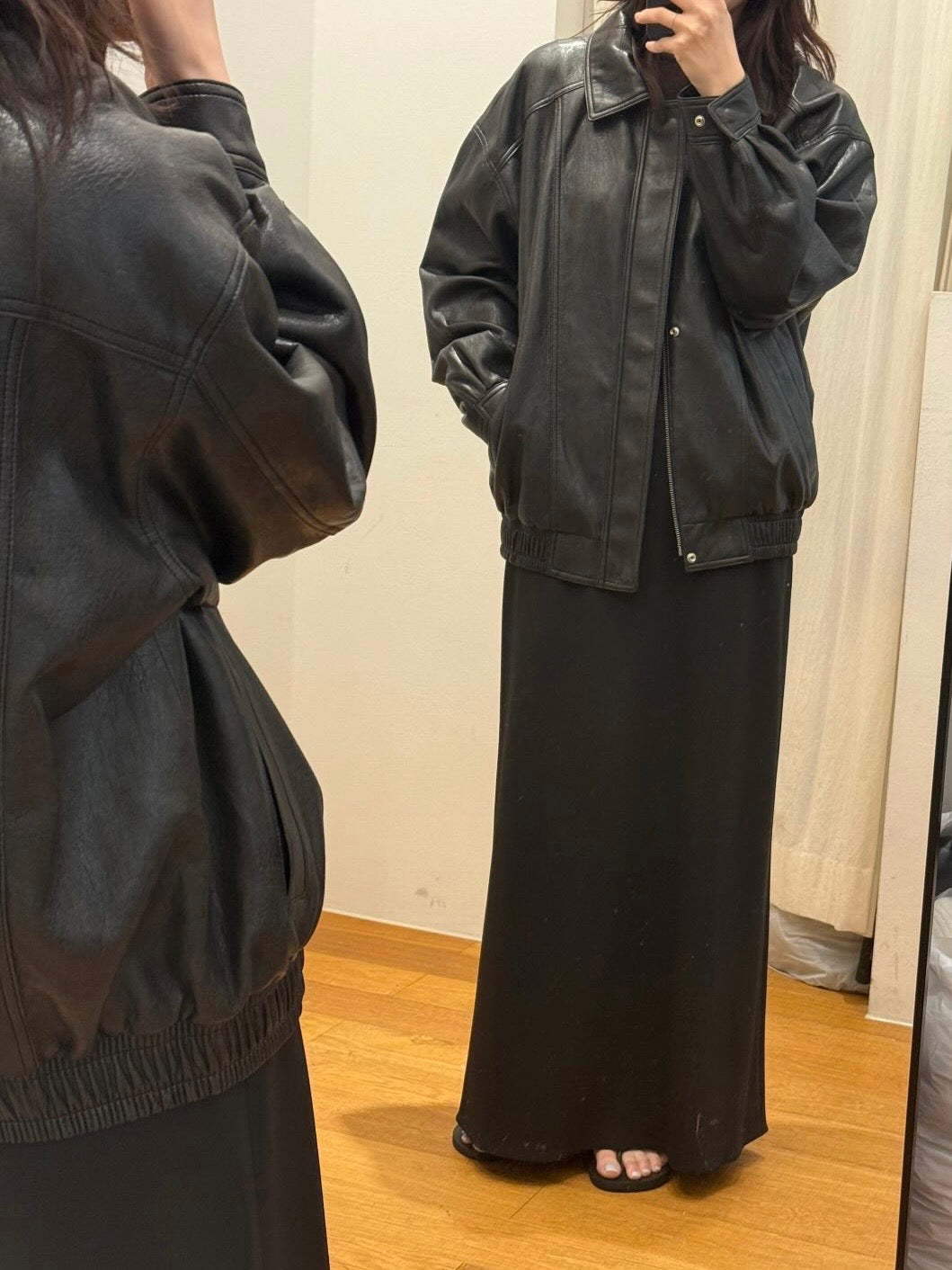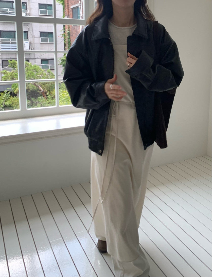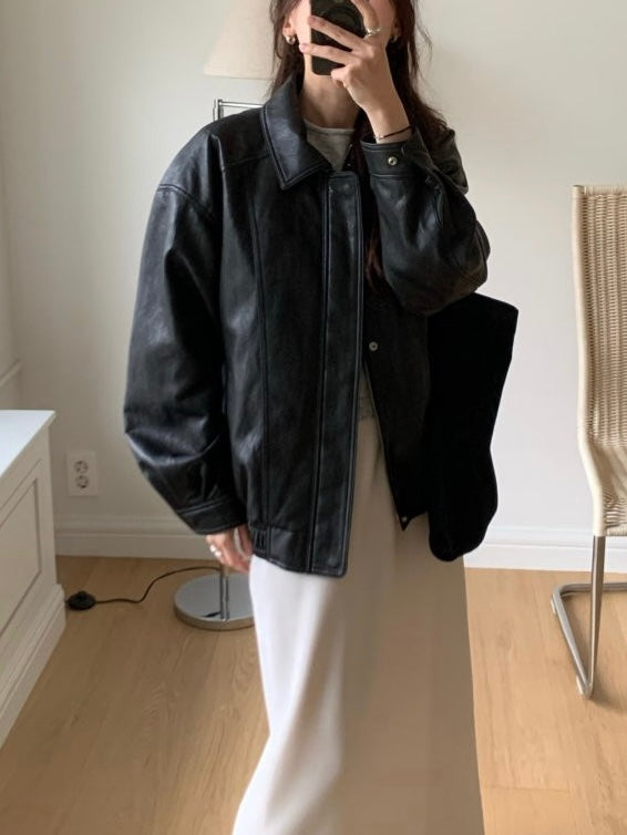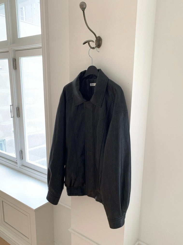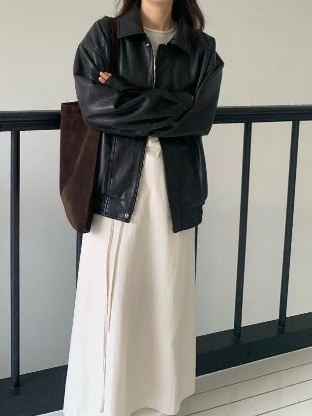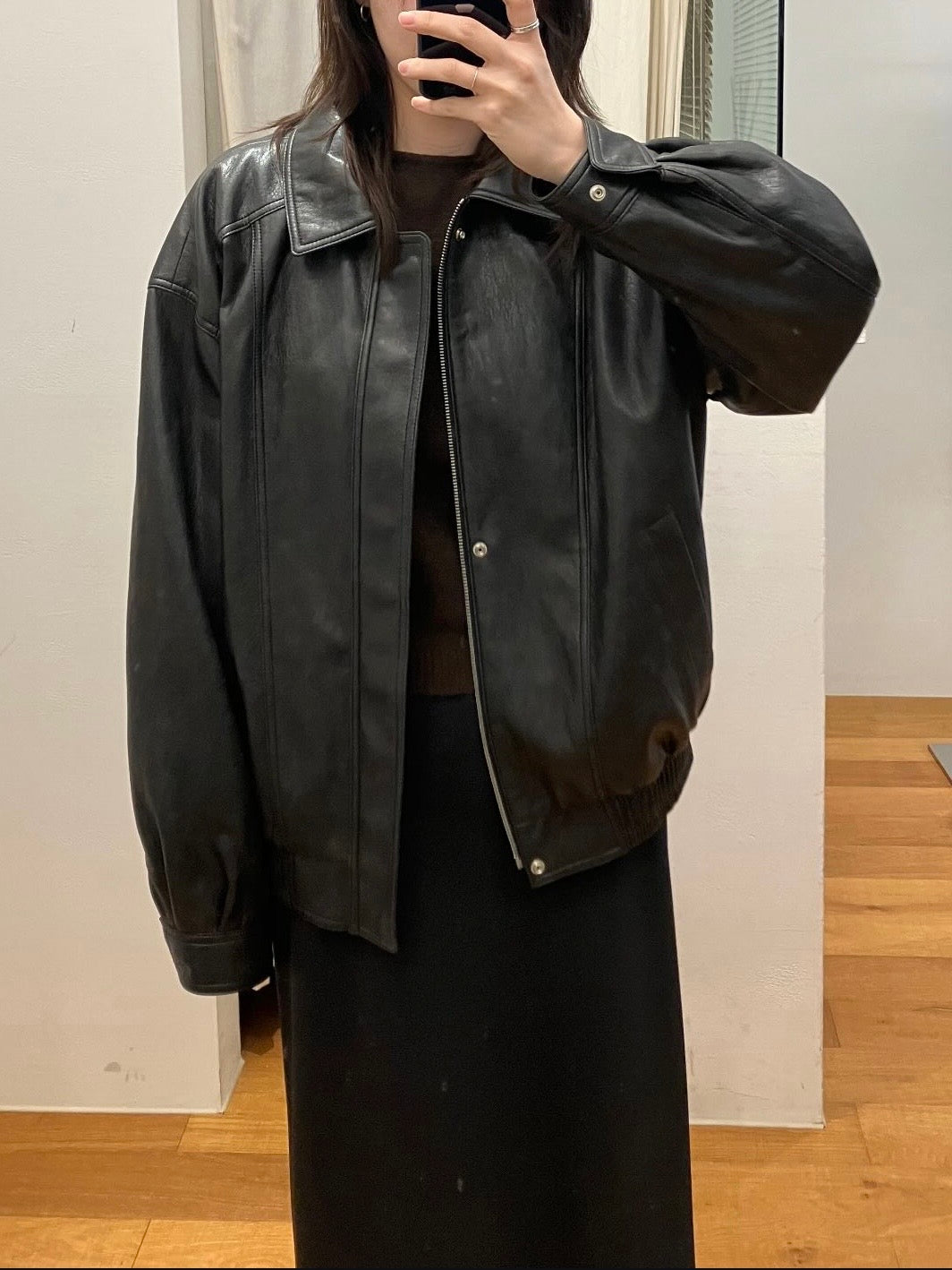 - Vegan leather jacket with vintage-inspired texture achieved through special washing process